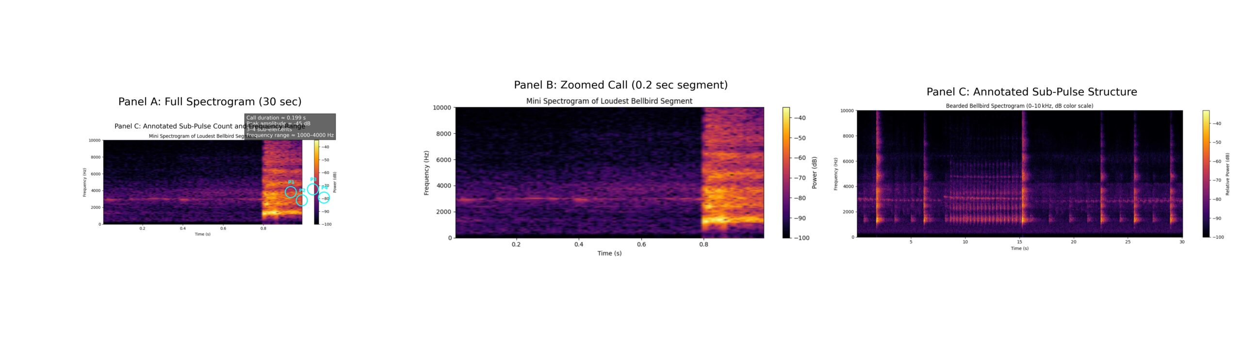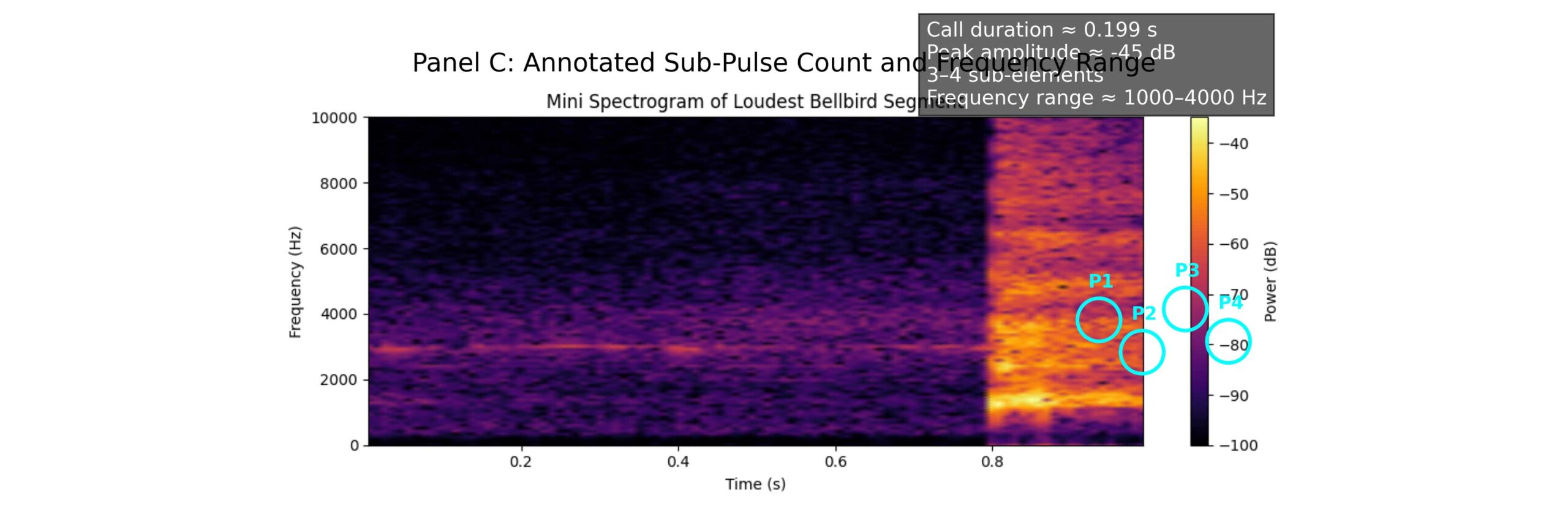 Panel C: Annotated call showing 4 sub-pulses, illustrating the rhythmic precision and intensity of the species’ signature note.
